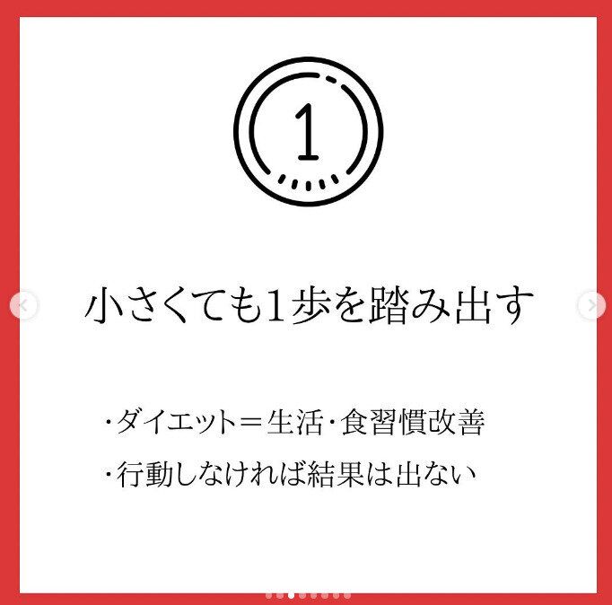 ダイエットとは、「今の生活と食習慣を改善すること」だといいます。今の生活や食習慣で太ってしまったのです。これらを変える行動をしなければ、なにも変わらないのです。まずは「小さくても1歩ふみだしましょう」とbona_kana.0201さんはいいます。