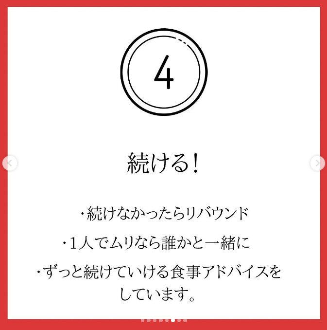 とにかく続けることがダイエットの基本。続かなければリバウンドします、と、bona_kana.0201さんはいいます。無理なく続けられる工夫をしていきましょう。ひとりで無理ならば、プロの手を借りてみるのもいいですね。
