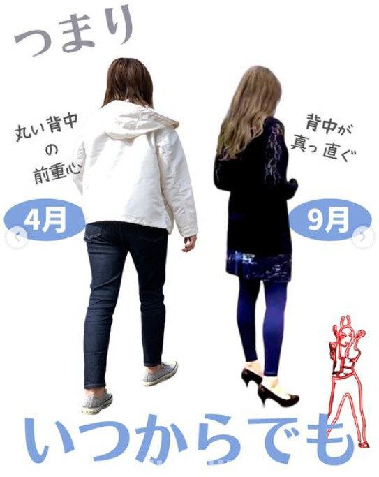 こちらがビフォーアフターの写真。5カ月で人はここまで変われるんです。ボディラインの変化だけでなく、立ち姿まで美しい!40代のyaseru_hanakoさん、「いつからでも変われる」といいます。