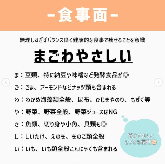 食事面では、「ま(豆類)ご(ごま)わ(わかめ・海藻類)や(野菜類)さ(魚)し(しいたけ・キノコ類)い(イモ類)」をとることを心がけます。__356gramさんのダイエットの基本は、栄養バランスのとれた食事が大前提。正しい食事で健康な体をつくっていきます。