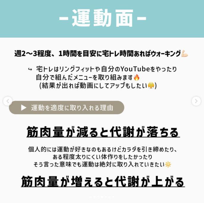 健康的な食事で体をつくり、適度な運動で筋肉量を増やしていくのが__356gramさんのダイエット方法。筋肉量を増やすのは、代謝をあげて太りにくい体をつくる基本。ただ、毎日ストイックにがんばるのではなく、週に2~3回程度、1時間を目安に自宅トレーニングやウォーキングを行います。