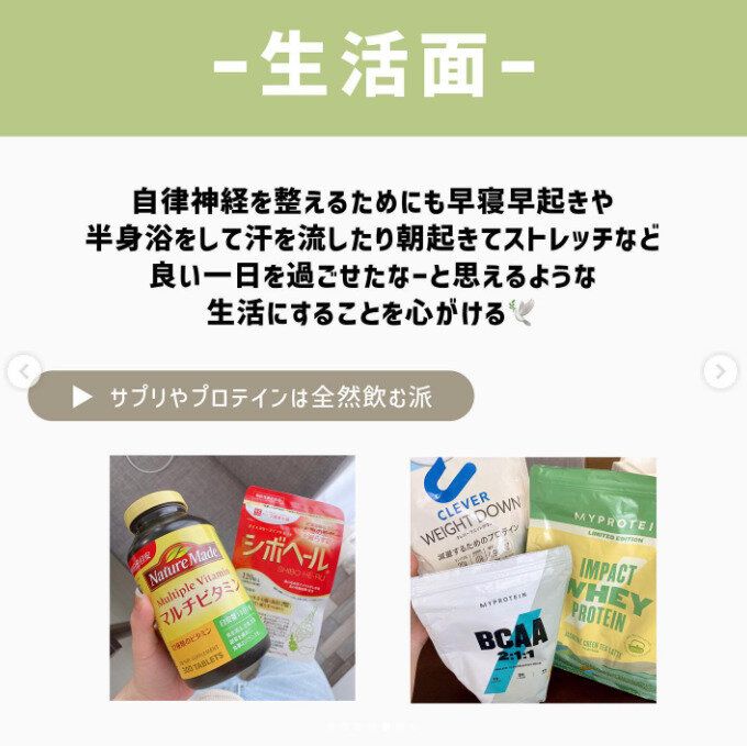 ストレスを抱えたままではダイエットは成功しません。自律神経を整えるためにも、生活面では早寝早起きを心がけ、半身浴をして汗を流したり、朝起きるとストレッチなどを行います。「今日1日、よい日を過ごせたなあ」と思えるような生活を心がけているのだそう。サプリメントなどもうまく取り入れながら、健康的な生活を目指します。