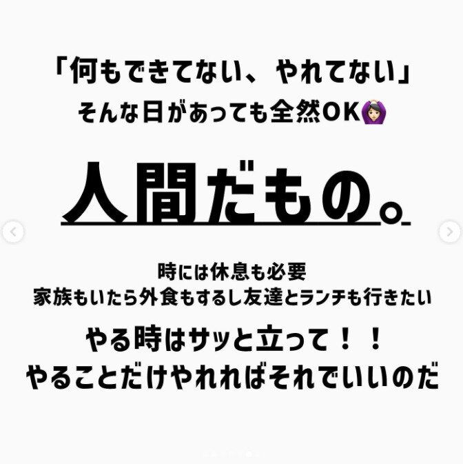 いそがしかったり、気分がのらなかったりと、何もできない日だってあります。でも、そんな日があってもOK!時には休息も必要と、できなかった自分を責めることはしません。追い込まないから、また次にがんばれる力がわいてくるのですね。
