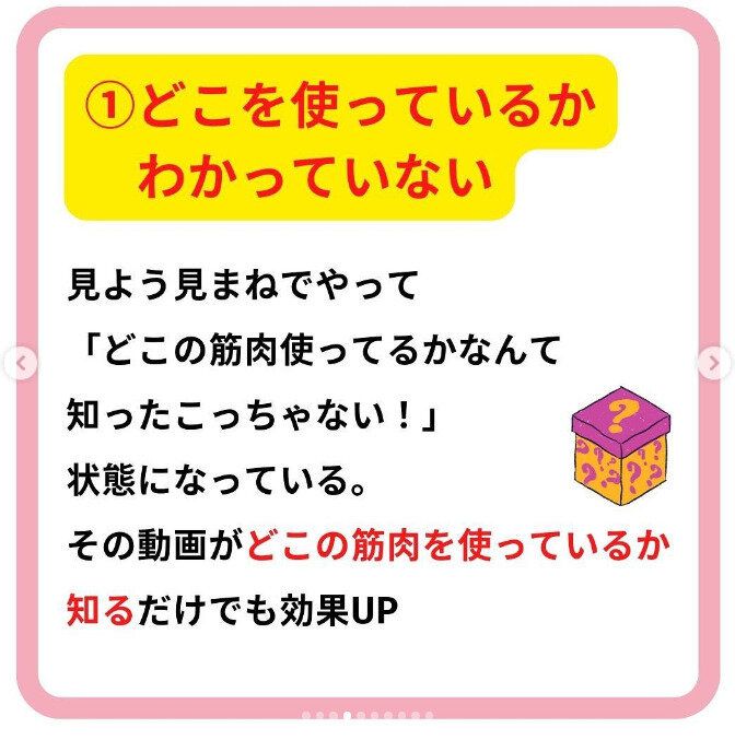 見よう見まねでやっているだけで、「どこの筋肉にきいているか」など、いまいちわかっていないということも。その動画がどこの筋肉をつかっているか知るだけでも、その効果はアップします。