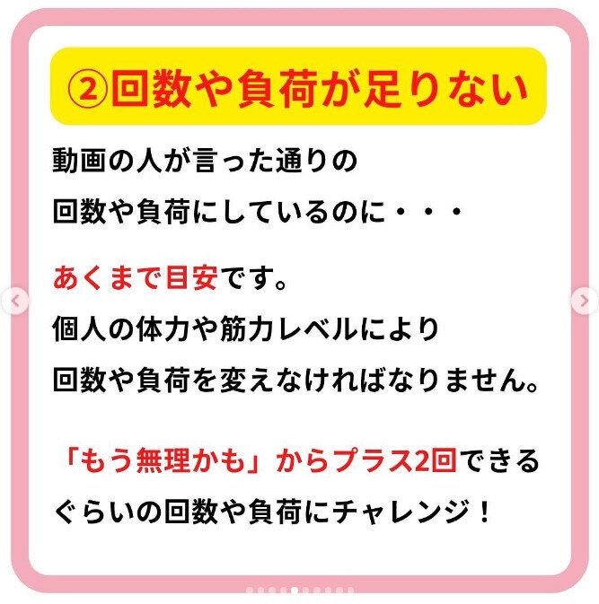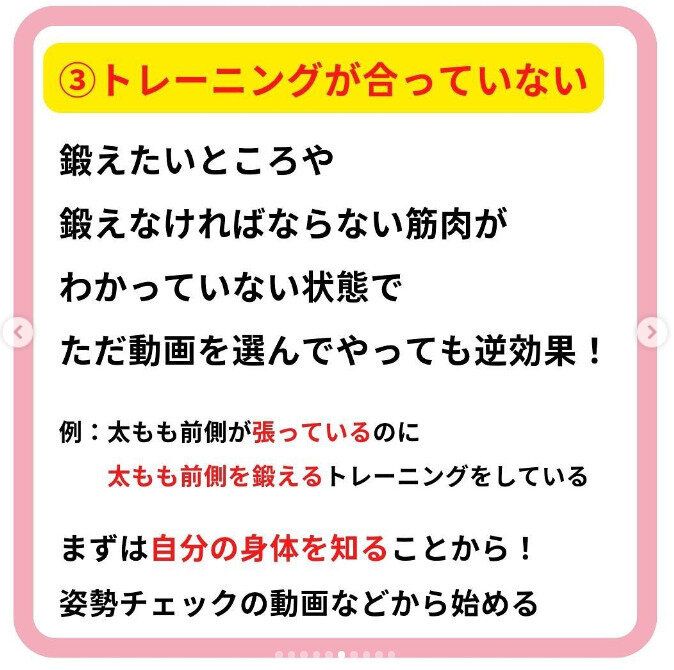 「動画を見ながらの運動、すばらしい意気込みだと思います。」とall_body_support_mariaさんも言います。しかし、SNS上でも「いまいち効果がでない」という人が多いのも事実。これには、やはり原因があるのです。