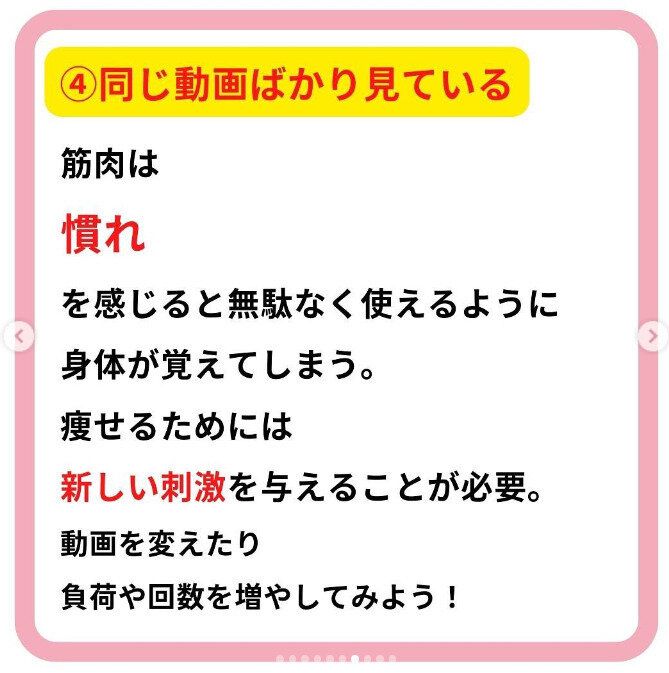 お気に入りの同じ動画ばかりを見ていませんか?筋肉は「慣れ」を感じると無駄なくつかえるように体が覚えてしまうのだそう!痩せるためには、「新しい刺激」を与えることが必要。動画を変えたり、あるいは負荷や回数を増やしてみるといいそうですよ。