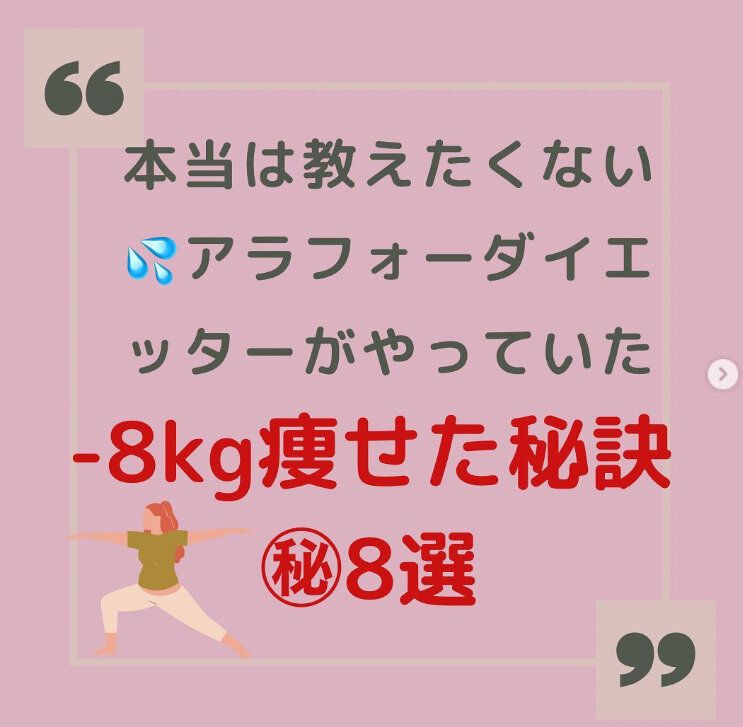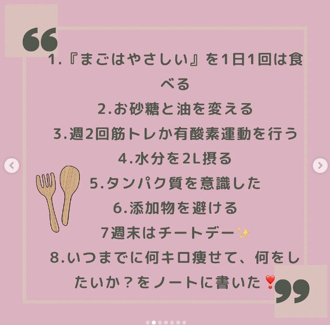-8kgを達成したdiet_advisor_mayumiさんが実践した、ダイエットの秘訣を8つご紹介しましょう。すべてをこなすのは難しいかもしれませんが、「痩せたその先を見たい!」のならば、ぜひやってほしいといいます。