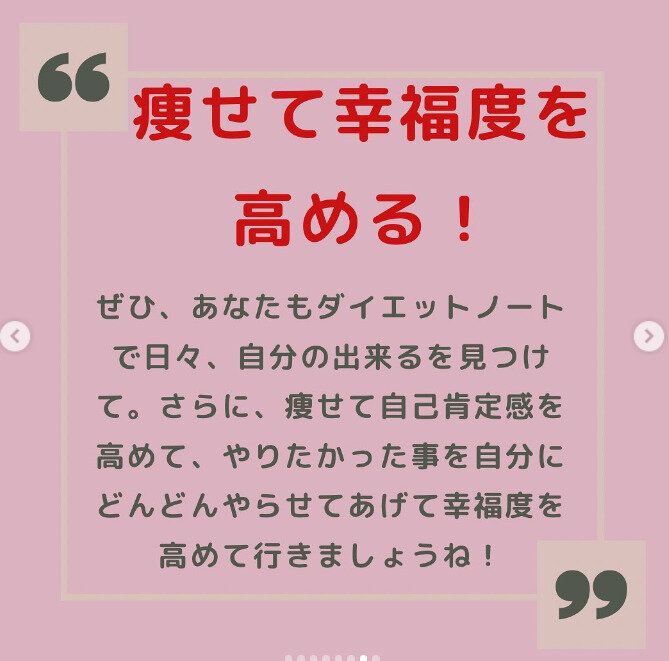 「今日できたこと」をダイエットノートにつけることで、自分に自信もつき、自己肯定感もあがるといいます。さらに健康的に痩せていくことで、自己肯定感はもっとアップし、幸福度もアップ!ダイエットに成功することで、やりたかったことをどんどんやって、幸福度も高まるなんて最高ですよね。