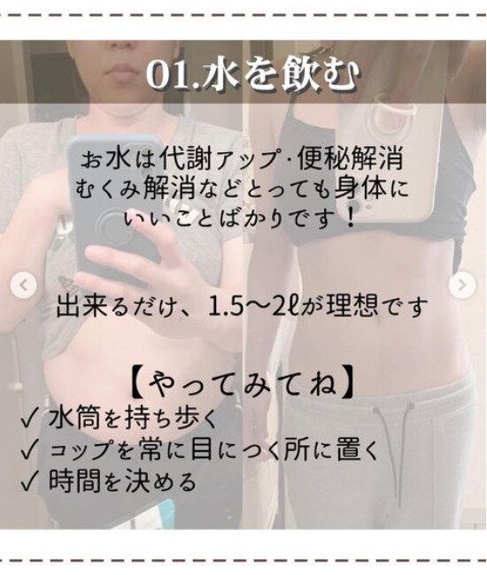 「水を飲むことは、代謝のアップ、便秘解消、むくみの解消など体にいいことばかりです!」と__nondiet__さんは言います。ただ、慣れていない人にとっては、水を飲む習慣ってむずかしいですよね。そんなときは、外出のときは水筒を持ち歩く、家ならばコップを目につくところに置いてみる、時間を決めて飲むなど、自分にあった方法で習慣化していくといいそうですよ。