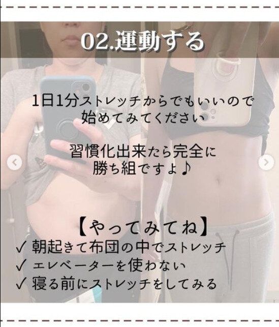 運動をする習慣を身につけましょう。とは言っても運動があまり好きではない…と言う人もいますよね。それならば、1日に1分でもいいのでストレッチから始めてみましょう。__nondiet__さんも、「習慣化できたら完全に勝ち組」だと言います。コツとしては、朝起きて布団の中でストレッチをする、エレベーターは使わない、寝る前にストレッチをするなど。まずは、できることから意識的に習慣化していくといいそうですよ。