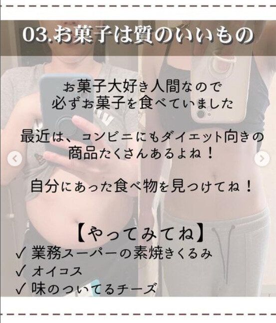 ダイエット中は、大好きなお菓子は我慢する?それではストレスがたまってしまいますよね。__nondiet__さんも、「お菓子大好き人間」ということで、必ずお菓子は食べています。ただ、質のよいものを食べるのがポイント。ダイエット向きのお菓子や、ヨーグルト、チーズなど、工夫しながらお菓子を食べたい欲を満たしています。