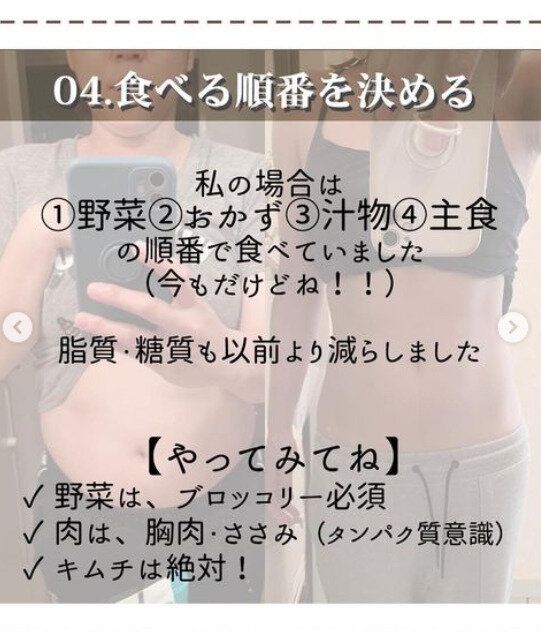 食べる順番は、「ベジファースト」で食べています。野菜→おかず→汁物→主食の順番。脂質や糖質は、以前よりは減らしながらも、バランスよく食べることを意識しています。