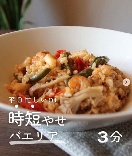たとえばこちらの写真は、準備は3分、炊飯器でつくるパエリアです。簡単なので、炊飯器でできる料理をつくることが多いそう。材料は、糖質オフでダイエットにもぴったりな「ロウカット玄米」を使っています。米を研ぐ手間も省けるのだそう。シーフードミックス、まいたけ、玉ねぎのみじん切り、インゲン、ミニトマトなどの野菜を入れて、調味料は、オリーブオイル、ケチャップ、コンソメ、塩、白ワインを入れて炊飯器のスイッチを押すだけ。炊けるのを待ちながら、自宅トレーニングや家事をすませていれば、おいしいパエリアが完成です!