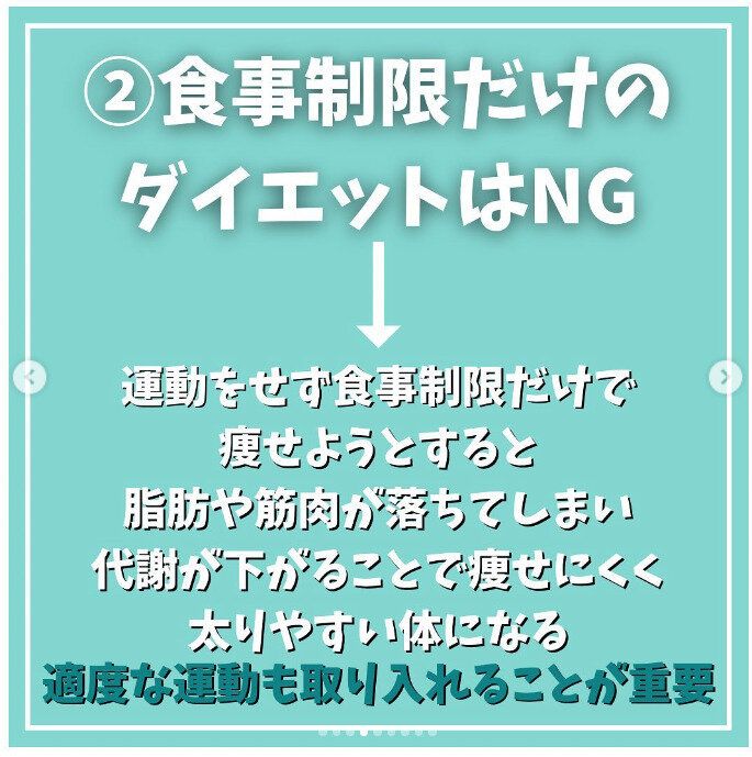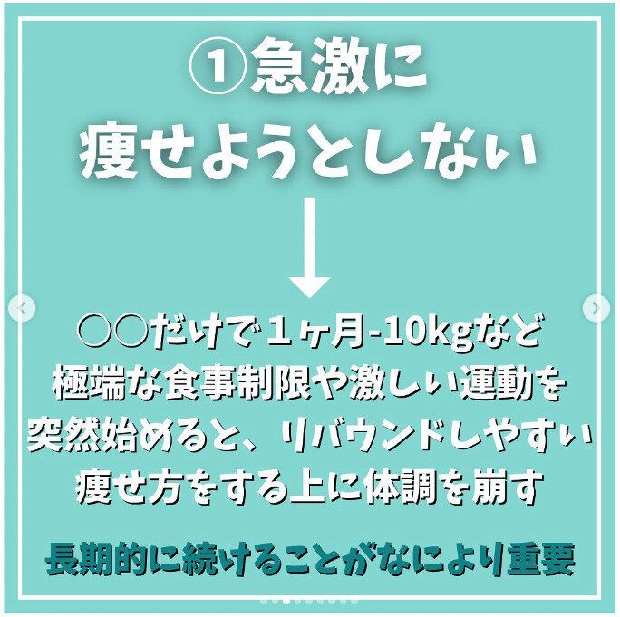 1つ目のポイントは、「来月、卒業式があるから!」などと急激なダイエットをする人も多いアラフォー世代。しかし、sango_diet_support_yukkyさんによると、極端な食事制限や今までやってこなかった激しい運動を突然始めると、リバウンドしやすいうえに、体調も崩してしまいがちだと言います。長い目で、ゆるやかに続けていくことが何よりも重要なのです。