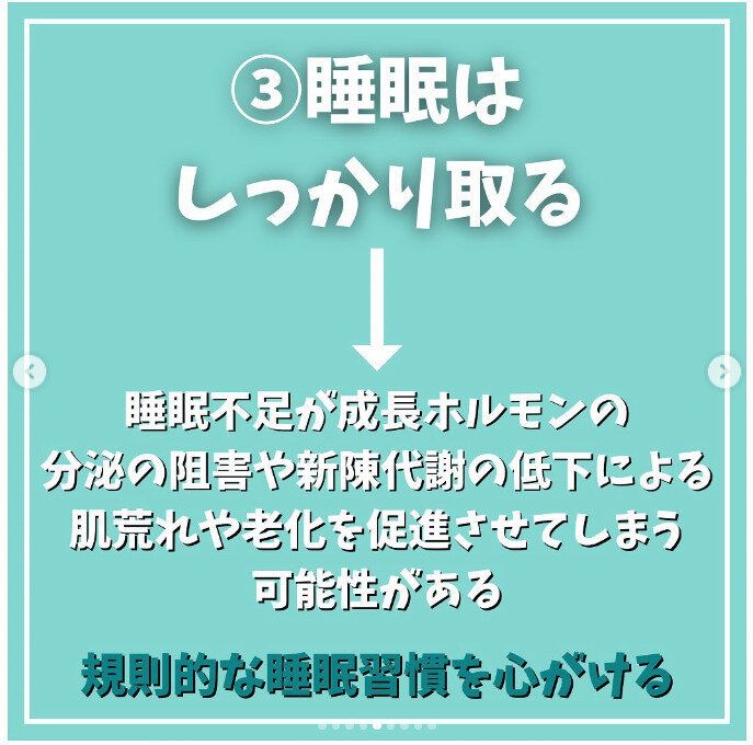 3つ目のポイントは「睡眠」。ダイエットと睡眠に何の関係が?と思いますが、じつは睡眠不足は成長ホルモンの分泌を阻害したり、新陳代謝の低下による肌荒れや老化促進させてしまう可能性があると言うのです。重要なのは、規則的な睡眠習慣を心がけることなのです。