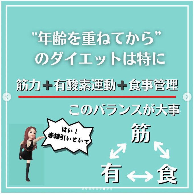 せっかく痩せたのに老けて見えるなんてことにならないように、年齢を重ねてからのダイエットで大切なことは、「筋力」「有酸素運動」「食事管理」の3つのバランスが大切。短期決戦で痩せよう!というのは若いころの話。ゆっくりと継続していきましょう。