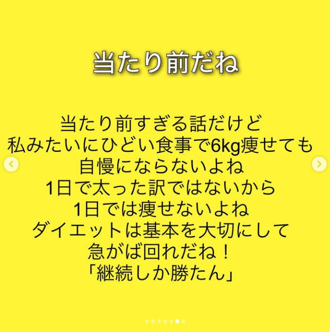 かたよった食事で短期間で痩せることがダイエットではない。ダイエットとは、基本を大切にして「継続すること」。そして、「メンタルを大切にすること」も、とても重要だとkinaco_dietさんはいいます。がんばっているのに結果が出ずにつらいこともありますよね。でも、コツコツと継続をして「今日も1歩進んだ自分」を、たっぷりとほめてあげましょう。そして明日も笑ってがんばりましょう!