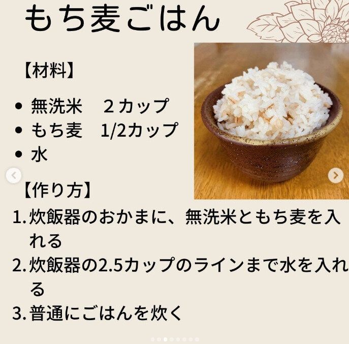 写真は、無洗米2カップに、もち麦1/2カップの分量。もち麦が初めての人には、3カップのお米に1/2カップのもち麦で炊くくらいの割合がおすすめなのだそう。おいしく習慣化していきたいですね。
