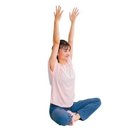 床に座って腕を上げたとき、手のひらは内側に向けて。次に、手のひらを外に向けながら両肘を曲げる。左右の肩甲骨を引き寄せるイメージで。