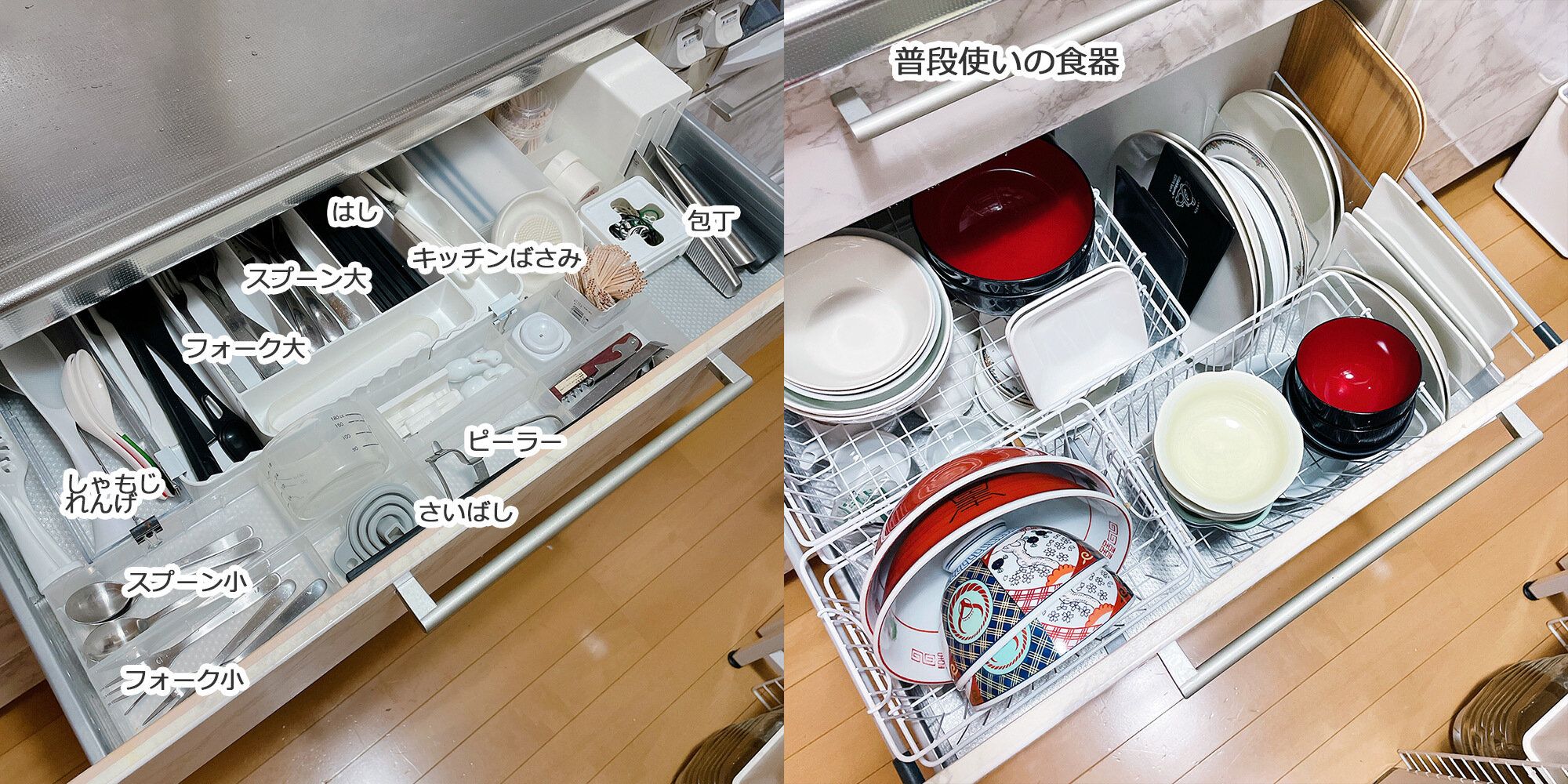 夫が使うものはキッチンの4つの引き出しに集結させています。