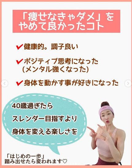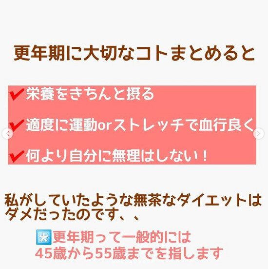 体の変化を感じることも多い40代の女性。risa.hs.bさんも無理なダイエットがたたってか、体の不調に悩まされていたそう。だからこそ、40代の女性たちに必要なこととは、「栄養をきちんと摂る」「適度な運動やストレッチで血行をよくする」「何よりも自分に無理はしない」という3つだったとrisa.hs.bさんは実感したのです。