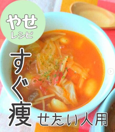 トマトベースの脂肪燃焼スープはダイエッターさんの強い味方。食べすぎてしまった…というときのリセットメニューはこれです。材料は、にんじん、たまねぎ、キャベツ、エノキ、鶏モモ、大豆の水煮をトマト缶、水、コンソメ、ニンニクチューブを入れて煮込むだけ。栄養バランスの取れた最高のスープです。大量につくって黒コショウ、ケチャップなどでアレンジするといいですよね。