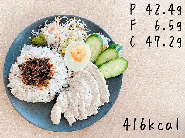 こちらがある日の朝ごはん。ライ麦パンや全粒粉パンなどの日も多い0102__mmmさんですが、この日は十六穀米におかかひじきをのせて。サラダチキン100gと、ゆで卵が半分にサラダ。ワンプレートに盛ると栄養バランスがよくわかります。