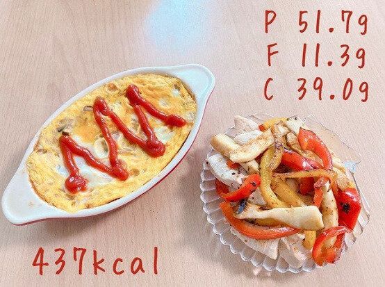 こちらはある日のお昼ごはん。オートミールオムライスと、鶏むね肉・エリンギ・パプリカのソテーです。ダイエット中も好きなものを食べたい!それならオートミールなどで置き換えるのがおすすめですよね。オートミールオムライスには玉ねぎ半分となすも半分入っているそうで野菜もたっぷりです。鶏むね肉は100g使い、パプリカとエリンギを入れてソテーしました。ボリューム満点で、こんなおいしそうなランチならお昼からもがんばれそうです!