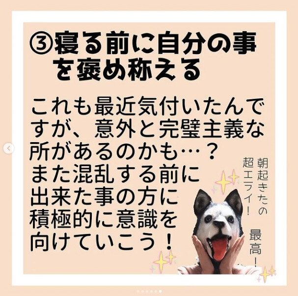 みなさんのダイエット、「今日はあれもできなかった…、あんなものを食べてしまった…」とできないことばかりに目を向けて自分を追い込んでいませんか?hira_mucchiさんは、「寝る前に自分のことをほめたたえる」ということを意識しています。絶対にできそうな小さな目標を立てて成功体験を積みあげ、「今日できたこと」に積極的に意識を向けていく。これダイエットのモチベーションにつながり、結果として長いスパンで継続することができるんですね。