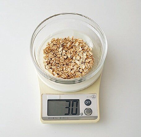 - 1 オートミール1食分(30g)を量る