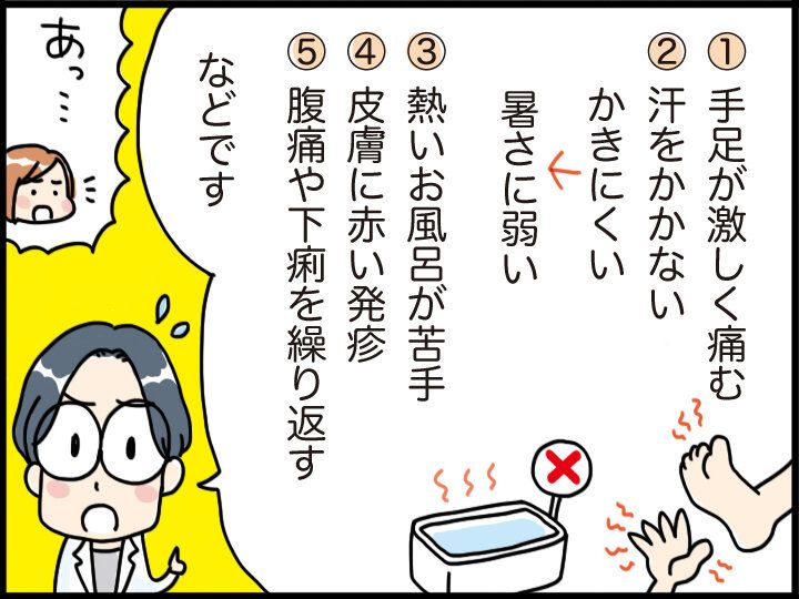 汗をかきにくい、疲れやすい、手足を痛がる…ちょっと気になるけど「体質?」と思っている症状が、実は病気のサインかもしれません。どんな病気の可能性があるのか、まんがで見てみましょう。