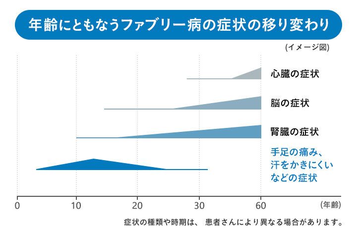 古典型の場合、早い子は2歳ごろから手足に強い痛みがみられることがあり、幼児期・学童期には、暑くても汗をかきにくい・かけない、手足の激しい痛み・しびれ、皮膚に赤い発疹(ぶつぶつ)といった症状。また、大人になってからは、腎不全や不整脈、心不全、脳梗塞(こうそく)などを発症しやすいといわれています。