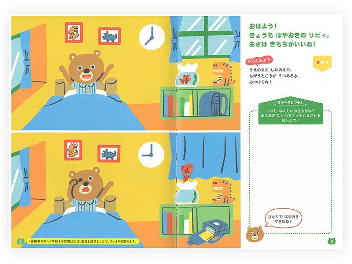 たとえば、「早寝早起き」のページ。2枚の絵の違うところを探してみると、上の絵の時計が「7時」なのに対し、下の絵では「9時」。上の絵ではきれいに立てかけられたランドセルが、下の絵では乱雑に置かれています。そうして違いを探しながら、お子さんは何時に起きているか、寝る前に翌日の準備ができているかを確認することができるというしかけ。