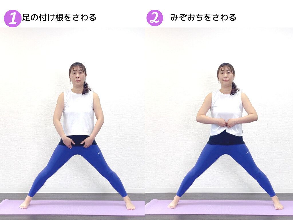 (1) 足を広げたまま、右足のつま先は真横に向けます。左足のつま先は軽く内側(おへそ側)へ向けましょう。