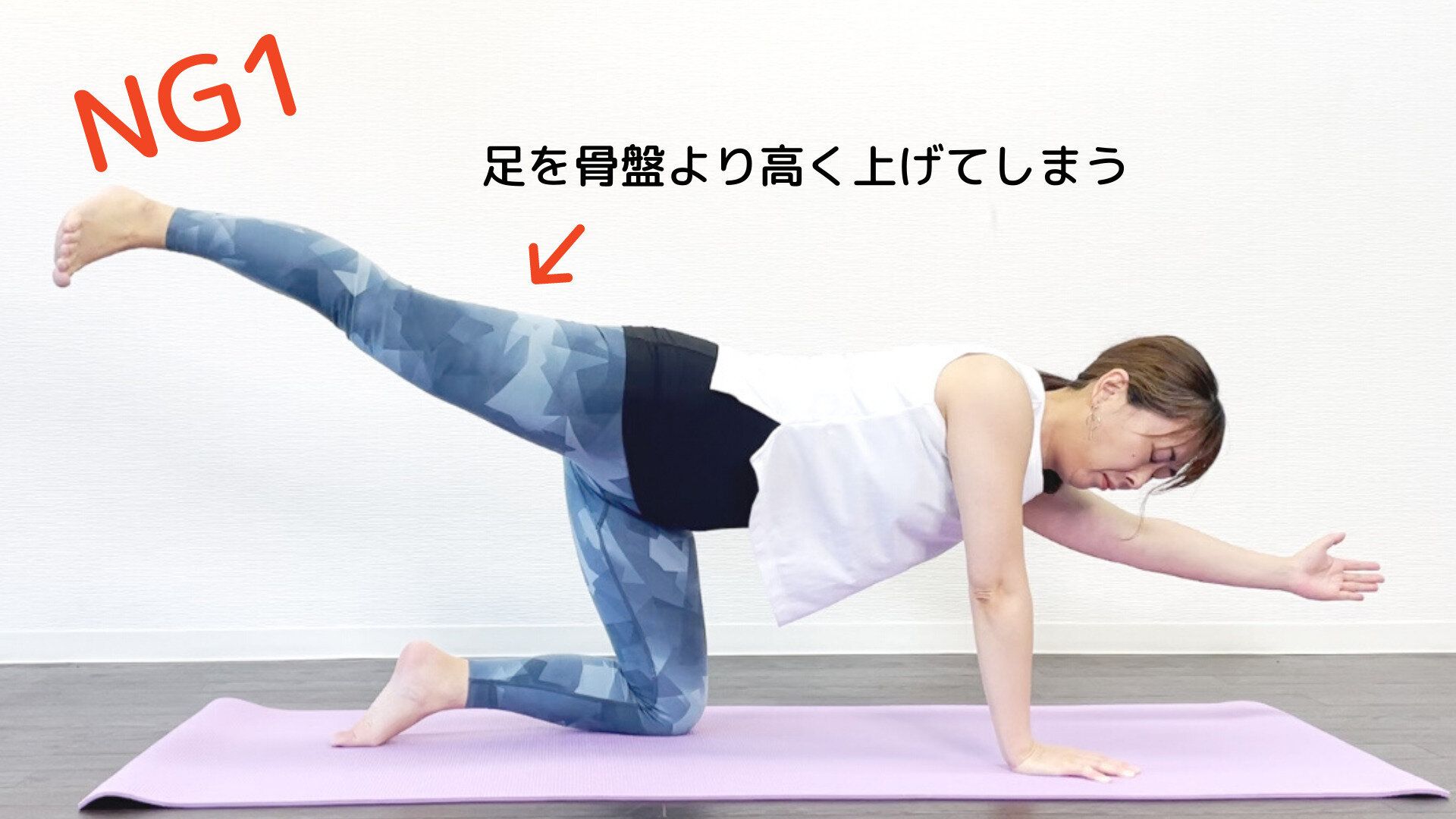 脚の高さは腰の高さでキープします。脚を高くあげすぎてしまうと、むだにお尻の筋肉を使いすぎてしまうので注意です。