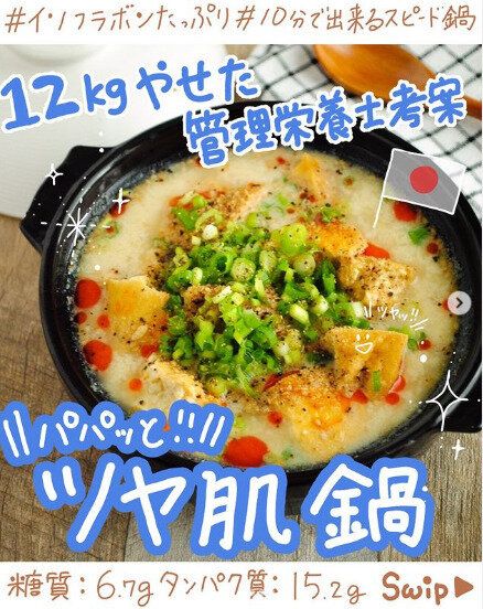 こちらはその名も「ツヤ肌鍋」。豆乳がたっぷりと入ってダイエット向きなだけでなく、美肌にも!つくり方は、鍋にごま油とニンニクを入れ、ちぎった厚揚げ、もやし、みそ、鶏ガラだし、水を入れて煮込みます。一度火をとめて豆乳を入れて再び火にかけます。沸騰直前で火をとめるのがポイント。すりごま、小ネギ、黒コショウ、ラー油をかけてできあがり!体を温めてくれる鍋はダイエットにもぴったりですね。