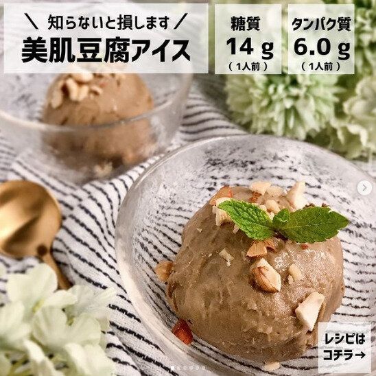 最後にダイエット中でも楽しめるデザートをご紹介。アボガドを使った、その名も「美肌豆腐アイス」です。つくり方は、絹ごし豆腐を二重のキッチンペーパーで包み、上に重めの皿をのせて、600wの電子レンジで1分半加熱。粗熱をとったら、アボカド、ハチミツ、純ココア、塩を加え、容器にいれてミキサーなどで混ぜます。保存袋に入れて約1時間半冷凍庫に。器にもり、砕いたミックスナッツとミントをのせて完成。アボガドで驚くほど濃厚なアイスが完成!