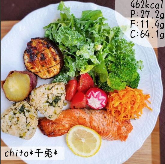 「P=たんぱく質」「F=脂質(脂肪)」「C=炭水化物」のバランスが整ったメニューが理想。でも具体的にはどんなメニューにすればいいの?そんなときはプロがつくるワンプレートメニューが参考になります。こちらはある日の献立。サーモンのハーブ焼き、大根菜のまぜご飯、焼き芋、ナスの味噌焼き、そしてモリモリの生野菜。chito_kinkatsugohanさんは、筋トレを取り入れながらのダイエットなのでタンパク質は少々多めの設定なのだそう。でも、ワンプレートメニューはひとめでわかるので、タンパク質、炭水化物の量などの目安になりますね。