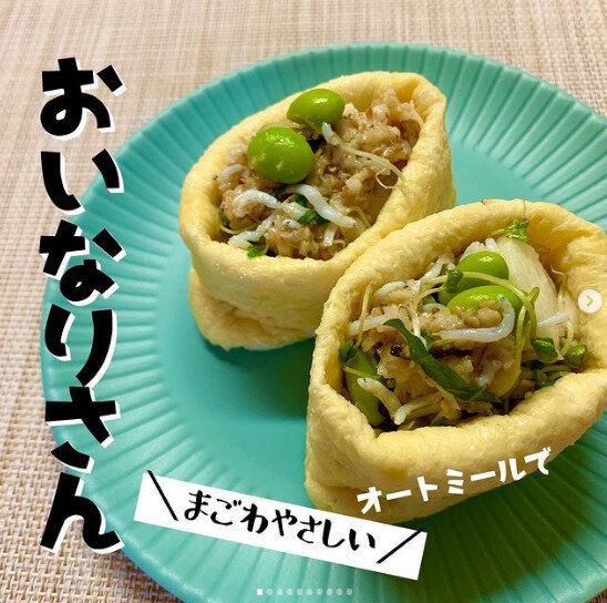 一生続けられるダイエットをめざして、毎日3食「ま(豆類)ご(ごま)わ(海藻類)や(野菜類)さ(魚)し(キノコ類)い(イモ類)」を意識して食べることを心がけているそう。こちらは、これひとつで「まごわやさしい」がかなうおいなりさんです。「油揚げ、枝豆、いりごま、塩こんぶ、ブロッコリースプラウト、大葉、しらす、乾燥しいたけ、長芋」を具材にして、オートミールでつくることでさらにヘルシー。