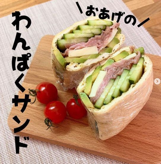 こちらも油揚げを使った逸品。むしゃむしゃ食べられる「わんぱくサンド」です。つくり方は簡単。ラップの上に、油抜きをした油揚げを置き、きゅうり、アボガド、ハムやチーズなど好きな食材を順番に重ねます。最後に油揚げをおいてラップできつめに包み、半分に切ったらできあがり!