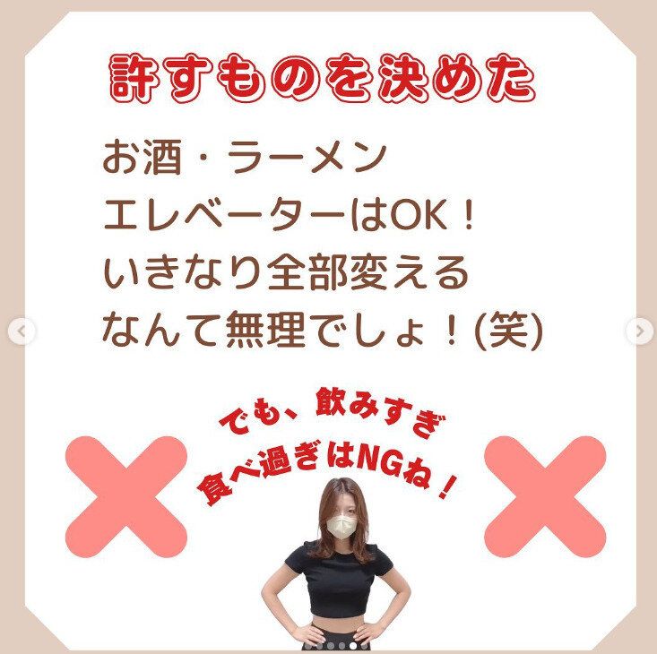 そして、理想とするイメージに近い女性をInstagramで発見!ダイエット動画を配信されており、毎日、真似をしながらがんばることからスタートしたのです。「こんな女性になりたい!」という思いは、日々のモチベーションのアップにつながります。