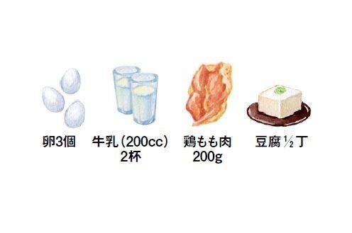 鶏肉と卵の両方をメインに使うことで、たんぱく質がたっぷりとれます。良質のたんぱく質を含む卵は毎食とりたい食材ですが、コレステロール値が気になる人は1日1個を目安に。