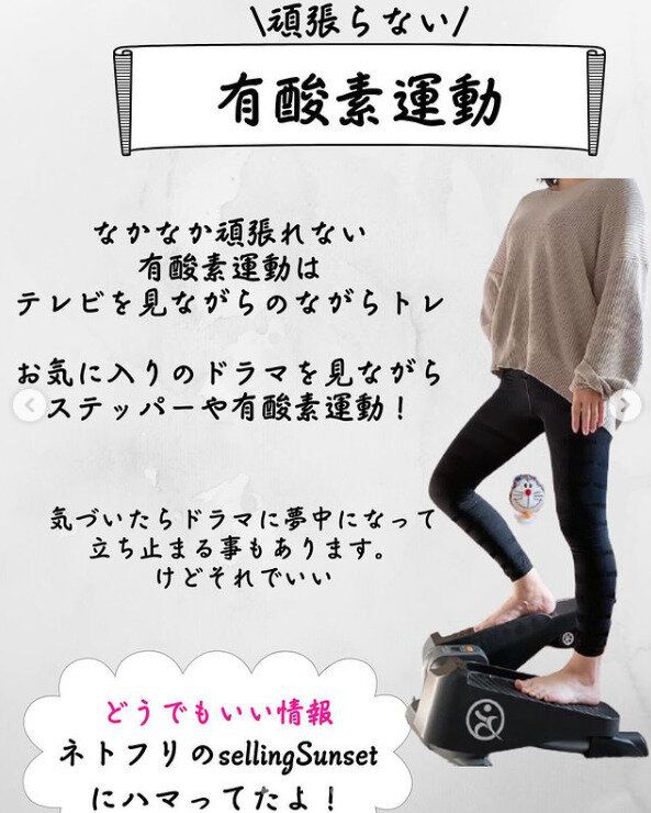 なかなか続かない有酸素運動は「ながら」がおすすめ。momomonworkoutさんは、お気に入りのドラマを見ながらステッパー運動を行っています。ほかにも、参考書をつかって踏み台を作成し、赤ちゃんの寝かしつけをしながら踏み台昇降運動を行ったのだそう。