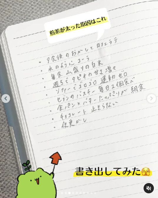 その前に!sen_cha123さんは、「自分が太った理由をよく考えて、まずは書き出してみよう!」と言います。そして「書き出した太った原因を今すぐにやめてみましょう!痩せたいと思って、何かプラスアルファのことをするよりも、その原因をマイナスしてあげることが大切」なんだそう。じつはこれこそが1番簡単で、続けやすいダイエット方法なのです。