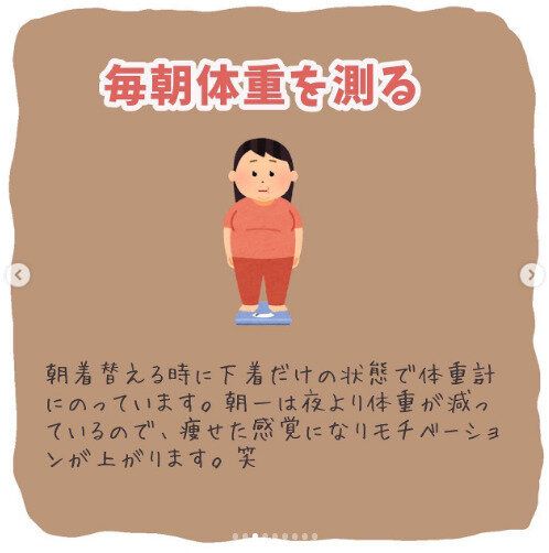 ますば朝、体重計にのることから始めました。「朝は夜より体重が減っているので、痩せた感覚になりモチベーションがあがります!」というnontan_dietさん。朝からモチベーションをあげれば、よし!今日もがんばろう!という気持ちになりますよね。
