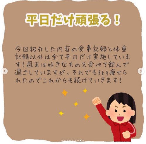 食事の記録や体重の記録以外はすべて平日だけ。それでも、3カ月で-3kgと順調に減量した実績と自信があるからこそ、これからも継続していきます!