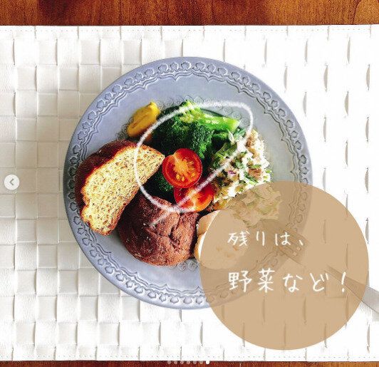 そして残りは野菜などを盛りつけます。これで、炭水化物、タンパク質、脂質がバランスよくとれることになるのです。tomoe_hanafastingさんも、この食べ方をするようになってから栄養バランスもよく、しかも食事の準備時間もぐんと減ったのだそうですよ。