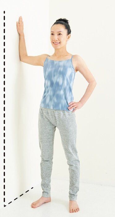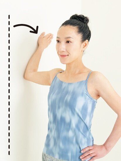 壁から少し離れ、足を肩幅に開いて立つ。肩とひじが同じ高さになるように右腕を上げ、ひじから手のひらまで壁に垂直につける。