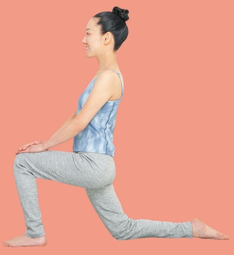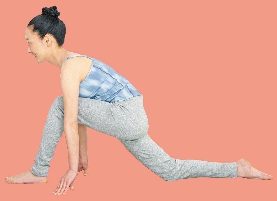 - 2 右足を真後ろに伸ばし、右太ももを床に近づける
