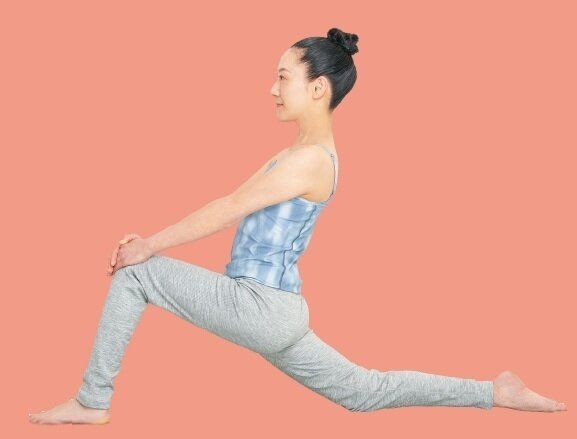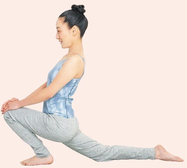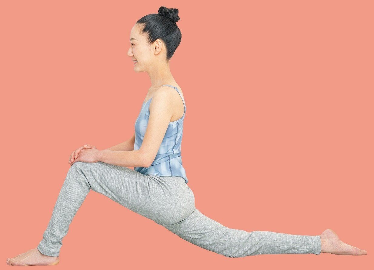 足を前後に開いて上半身を起こすと、おなかの深層部にある大腰筋、太ももの内側(内転筋)、裏側(半腱様筋、半膜様筋)が伸びます。股関節の可動域が広がって、「ミトコンドリア」の働きを促進!